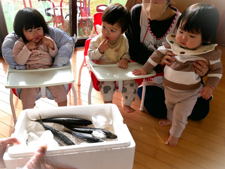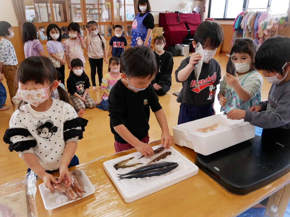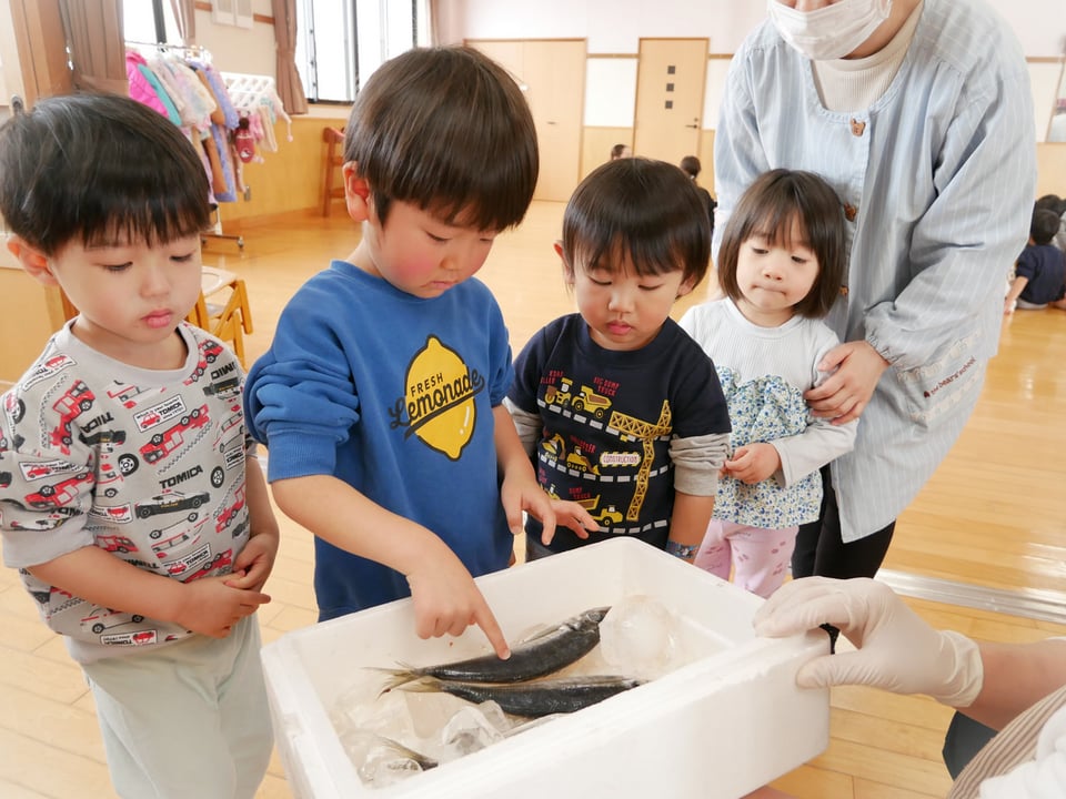 ホールに移動すると、「お魚の匂いするね」「何の魚かな」と話す子どもたち。